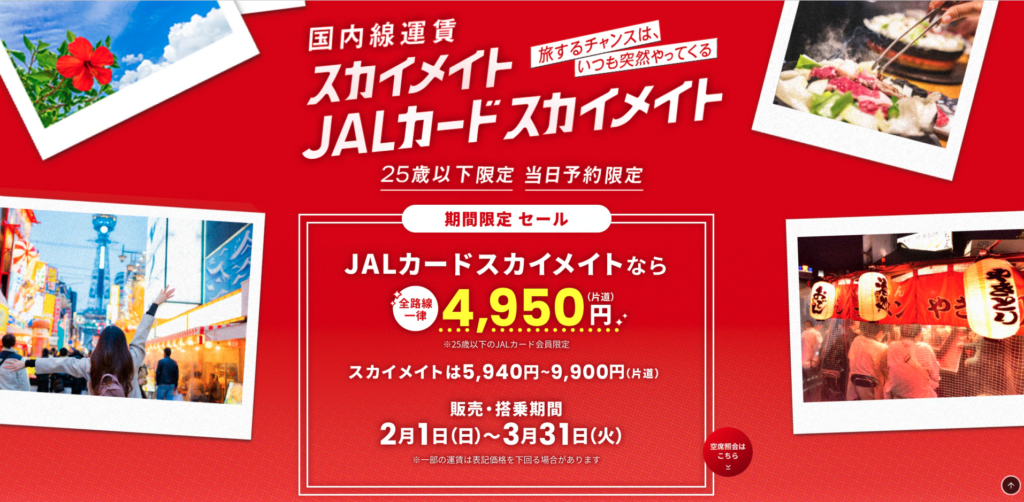 特に25歳以下のスカイメイト会員だと、当日予約限定という制限はつくものの、国内線の片道は全路線4,950円で乗れてしまいます!