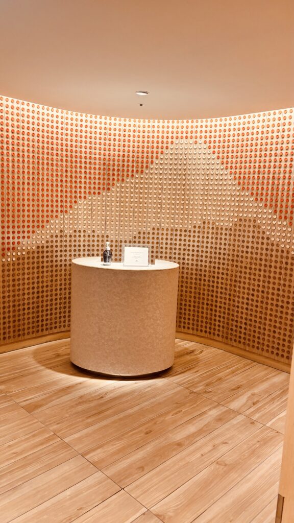 入るとすぐに日本航空のマークと同じような白と赤をモチーフにした装飾が天井から吊るされていて、豪華さを感じさせてくれます。