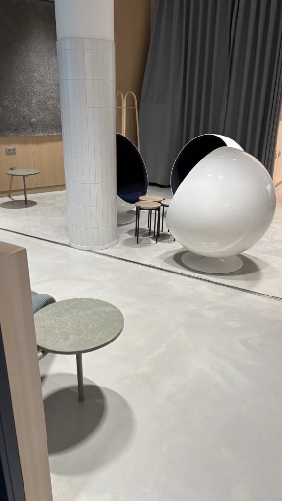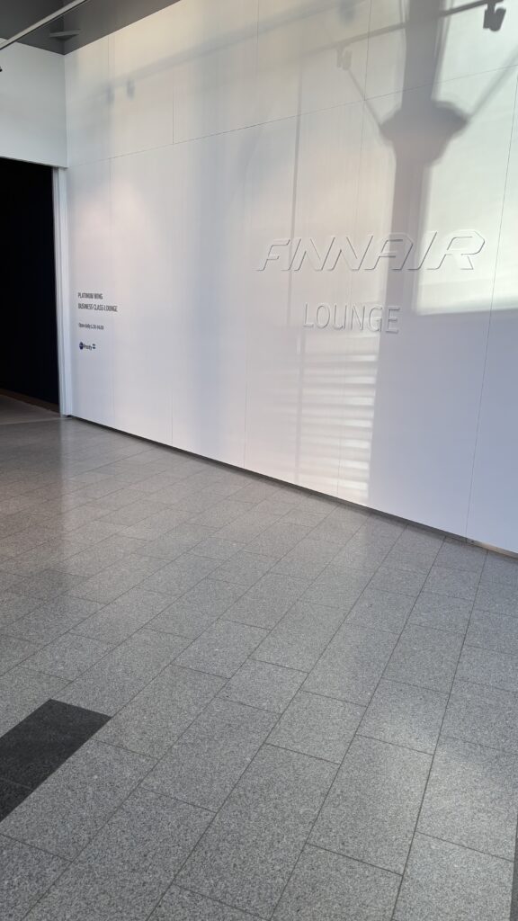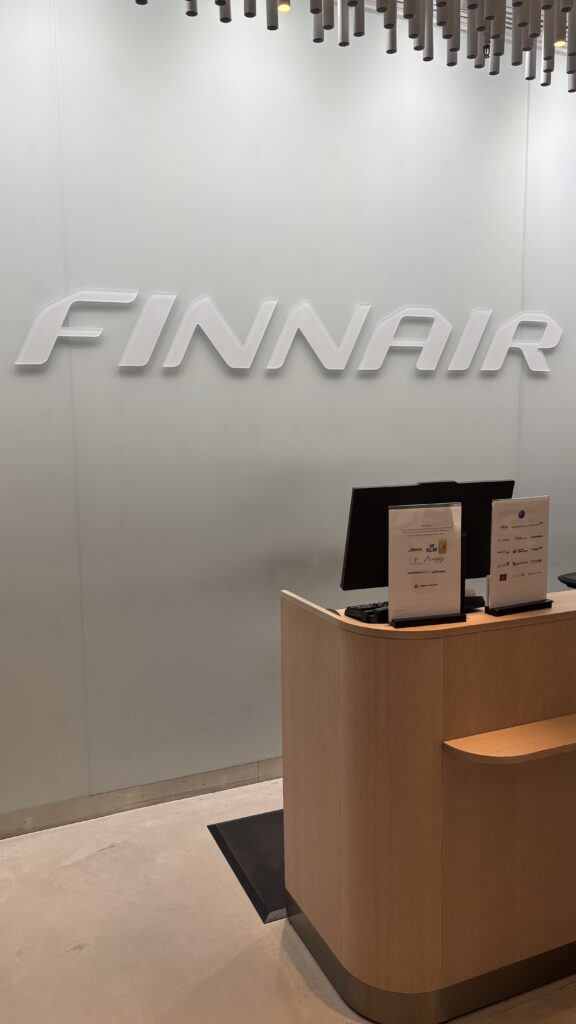 フィンエアーラウンジ前は白地ベースのフィンエアーのロゴがあり、とてもシンプルできれいです。